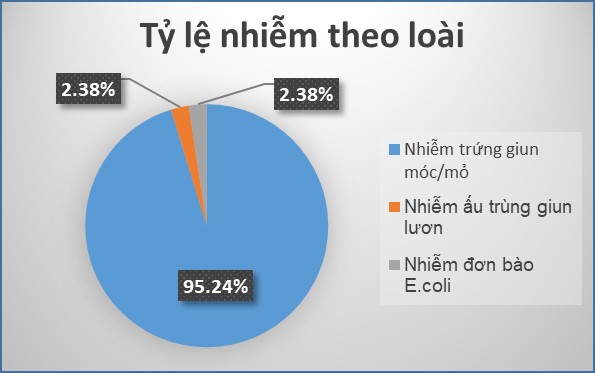 Trong số 362 mẫu phân thu thập được từ người dân xã Bảo Thuận, huyện Di Linh, tỉnh Lâm Đồng thì có 150 ca dương tính (chiếm tỷ lệ 41,44%) trong đó: 08 mẫu nhiễm đơn bào chiếm tỷ lệ 2,21% (07 mẫu nhiễm Etamoeba coli,01 mẫu nhiễm G. lamblia), 01 mẫu nhiễm ấu trùng giun lươn (chiếm tỷ lệ 0,28%), 135 mẫunhiễm trứng giun móc/mỏ (chiếm tỷ lệ 37,29%), 01 mẫu nhiễm trứng giun kim (chiếm tỷ lệ 0,28%), 01 mẫu nhiễm trứng giun tóc (chiếm tỷ lệ 0,28%), 04 ca nhiễm phối hợp (01 mẫu nhiễm giun kim + giun móc; 01 mẫu nhiễm giun móc + giun tóc; 02 mẫu nhiễm giun móc và E.coli) (chiếm tỷ lệ 1,10%).