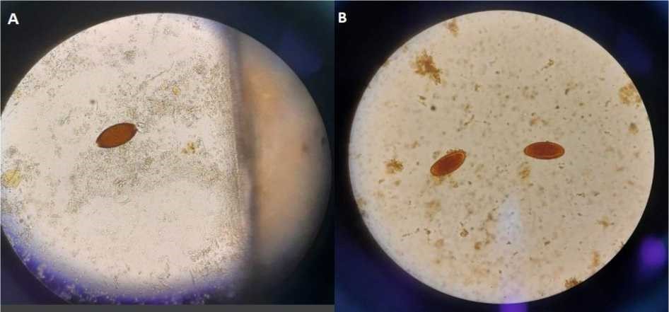 Hình 3: Trứng giun tócTrichuris trichiura(A) và trứng giun kimEnterobius vermicularis(B) trên mẫu phân người soi dưới kính hiển vi