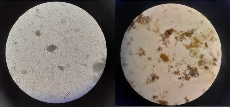 Hình 2: Trứng giun móc/mỏ (Ancylostoma duodenale/Necator americanus) trên mẫu phân người soi dưới kính hiển vi