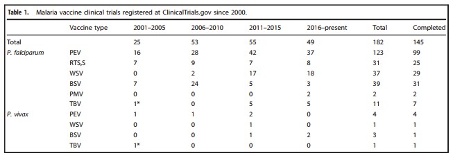 Trong 20 năm qua, tỷ lệ thử nghiệm vắc xin sốt rét mới đã đăng ký tại ClinicalTrials.gov, một địa điểm chính để đăng ký các thử nghiệm lâm sàng từ năm 2000 (https://clinicaltrials.gov/ct2/aboutsite/history), vẫn ổn định ở mức khoảng 10 thử nghiệm mỗi năm (Bảng 1).