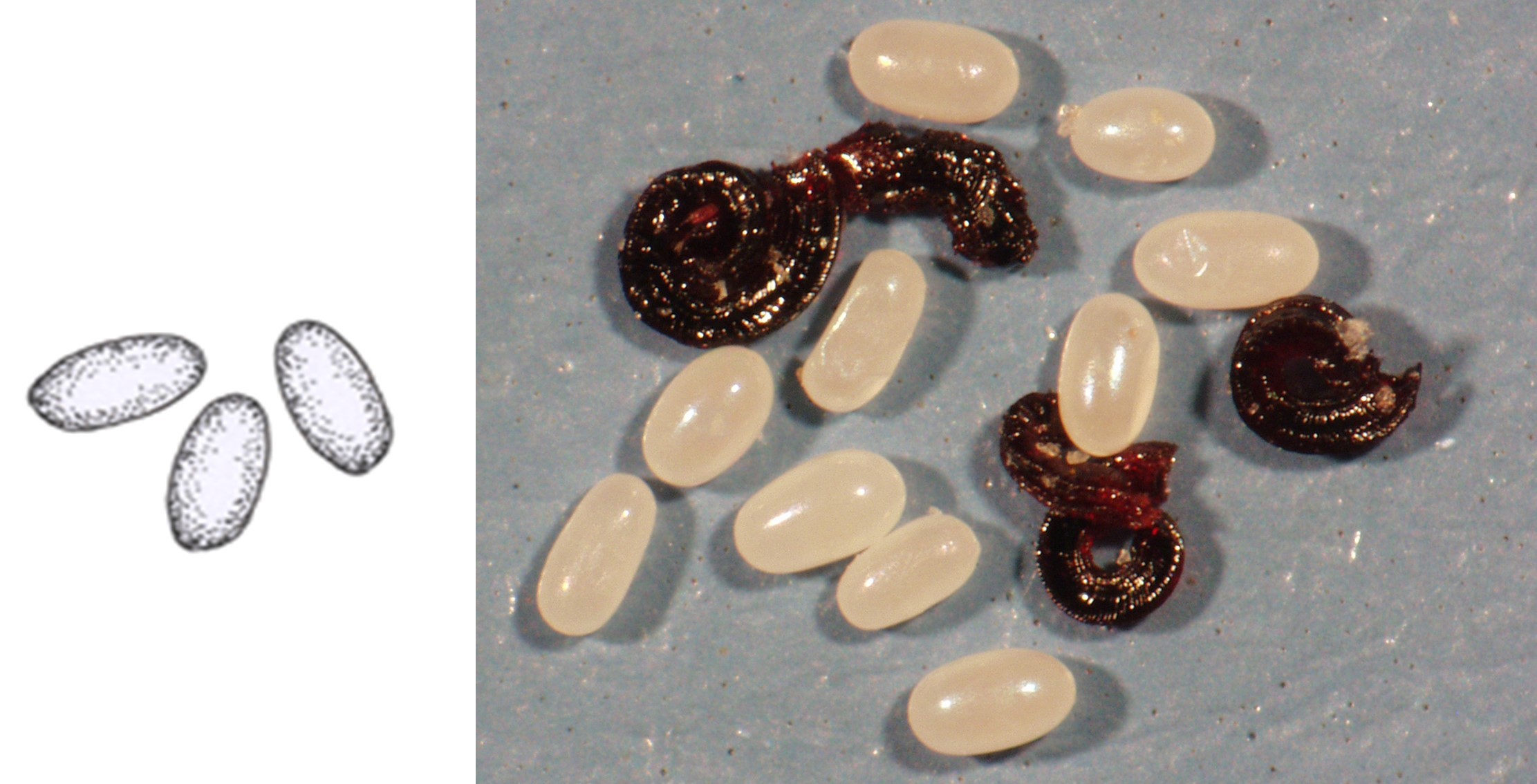 Hình bầu dục, vỏ láng, màu trắng hay kem, dài 0,5 mm.
