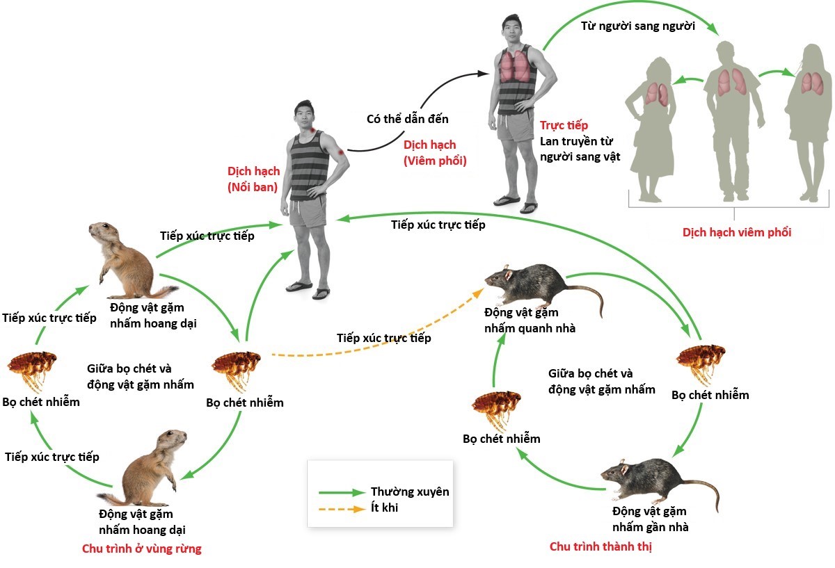 Vi khuẩn Yersinia pestis làm chuột mắc bệnh rồi chết. Khi chuột sắp chết, nhiệt độ giảm, bọ chét nhảy ra tìm ký chủ khác. Bọ chét khi ký sinh trên chuột đã hút máu chuột có vi khuẩn dịch hạch[7].