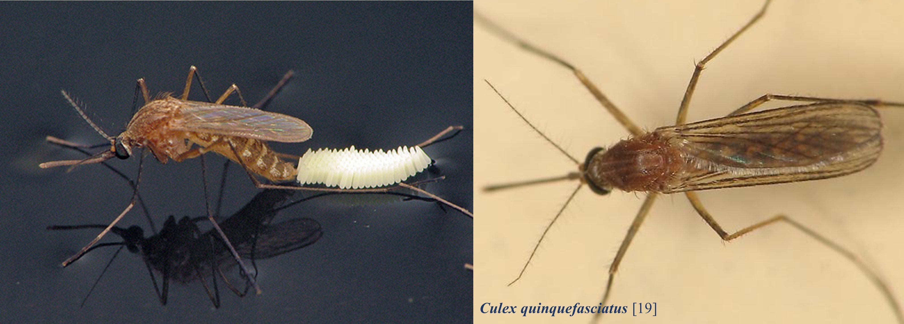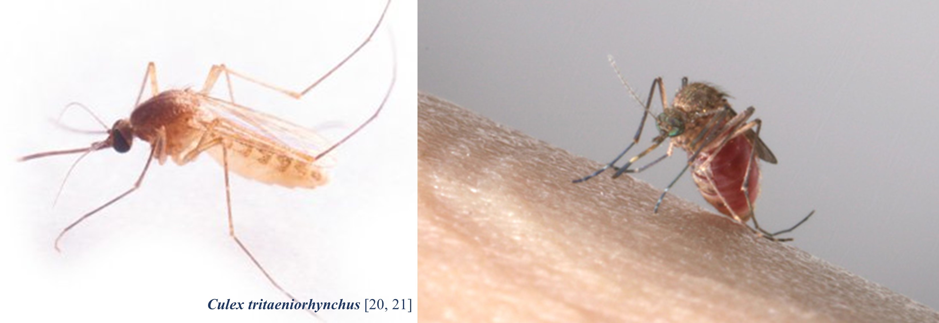 - Theo nghiên cứu của Hồ Thị Việt Thu và cộng sự (2012) [4], thành phần loài muỗi Culex – mối tương quan giữa mật độ muỗi và tỷ lệ nhiễm vi rút viêm não Nhật Bản trên heo tại TP. Cần Thơ và tỉnh Bạc Liêu, đã xác định được 8 loài muỗi Culex: Cx.tritaeniorhynchus, Cx. sitiens, Cx. gelidus, Cx. vishnui , Cx. pseudovishnui, Cx. bitaeniorhynchus, Cx. fatigans(Cx.quinquefasciatus), Cx. fuscocephala.