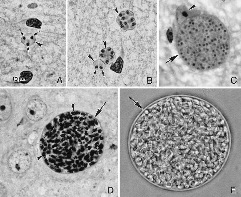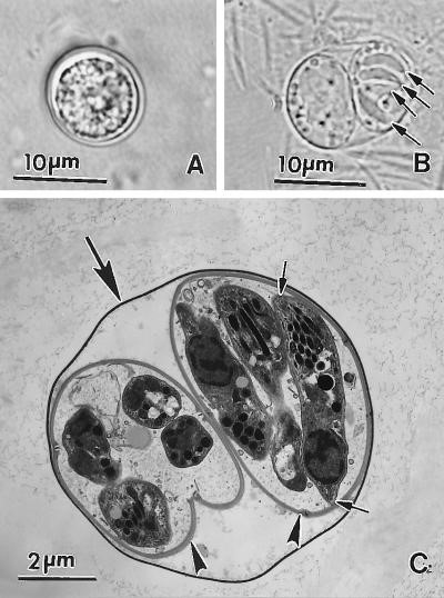 Hình 3.Nang trứng (oocyst) của T. gondii . (A) Oocyst chưa bào tử hóa. (B) Oocyst đã bào tử hóa với hai sporocyst. Có thể nhìn thấy bốn sporozoit (mũi tên) trong một sporocyst. (C) Ảnh chụp bằng kính hiển vi điện tử truyền qua của một oocyst đã bào tử hóa. [3]