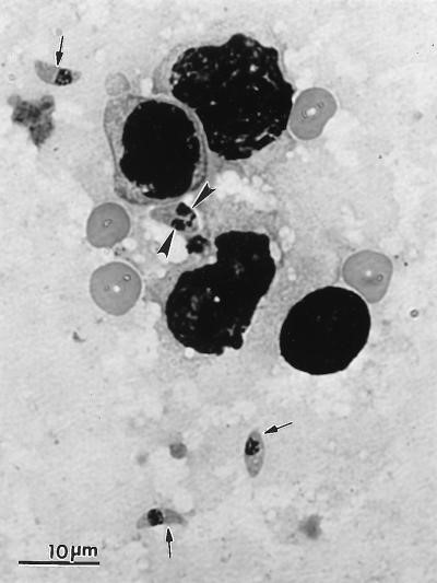 Hình 1.Thể hoạt động (tachyzoit) của T. gondii. Một tachyzoite đang phân chia (tam giác) và các tachyzoit đơn (mũi tên).