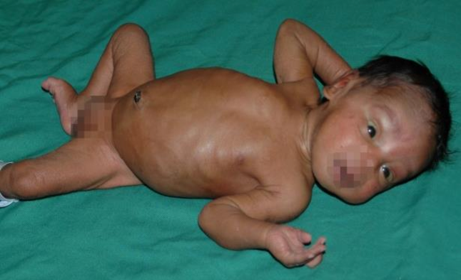 Hình 5.Em bé 18 ngày tuổi mắc bệnh Toxoplasma bẩm sinh vẫn còn vàng da và bụng trướng (gan lách to)[8]