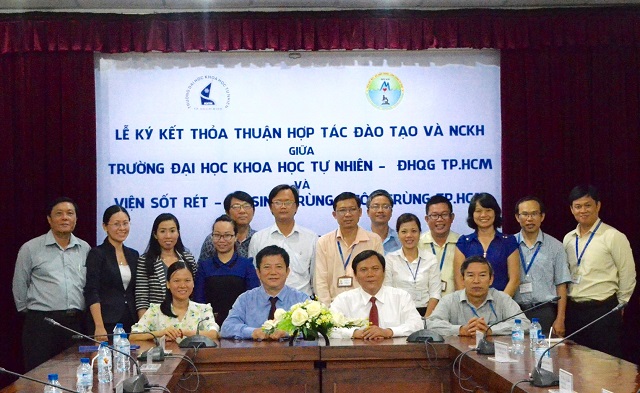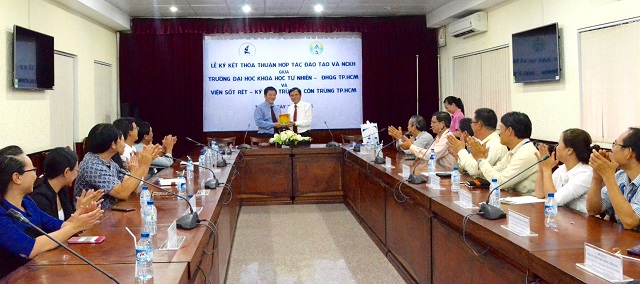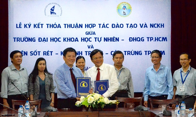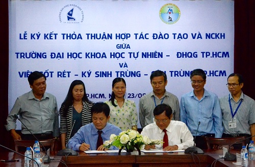Qua một thời gian chuẩn bị các thủ tục, được sự thống nhất của Lãnh đạo Nhà trường và Lãnh đạo Viện, ngày 24/09/2016, Viện Sốt rét - KST - CT TP. HCM và Trường ĐHTN - ĐHQG TP. HCM đã long trọng tổ chức buổi Lễ ký kết dưới sự chứng kiến của đại diện lãnh đạo, đại diện các khoa, phòng, đơn vị liên quan của hai bên về hợp tác đào tạo và nghiên cứu khoa học giữa hai đơn vị.