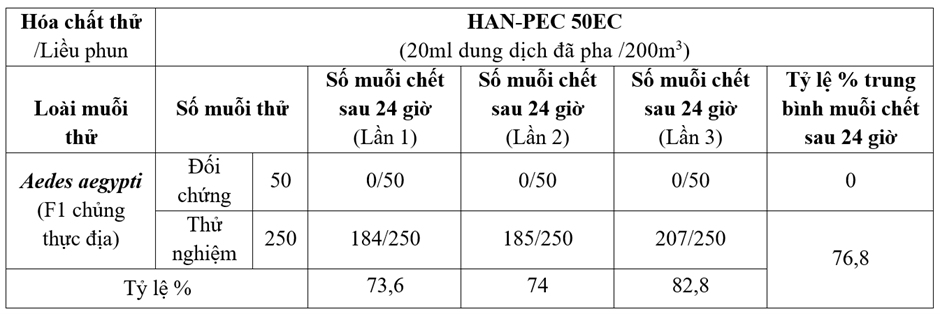 - Tỷ lệ muỗi chết trung bình sau 24 giờ đạt 76,8% khi pha loãng 100ml hóa chất HAN-PEC 50EC với 1000ml nước theo tỷ lệ 1:10 và phun diệt muỗi Aedes aegypti bằng phương pháp ULV với liều phun 20ml dung dịch đã pha /200m3.