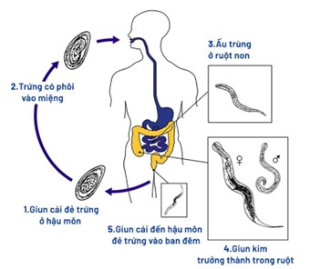 Một số trứng ở vùng hậu môn có thể trở thành ấu trùng, ấu trùng chui vào hậu môn lên ruột để phát triển, do đó việc tái nhiễm giun kim rất dễ dàng.