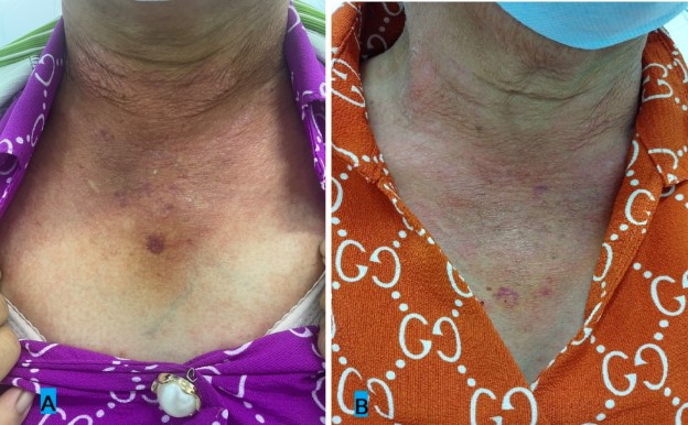 Hình 1.Hình ảnh nấm da ở bệnh nhân N.T.N.M (A:12/09/2022, B:13/10/2022)
