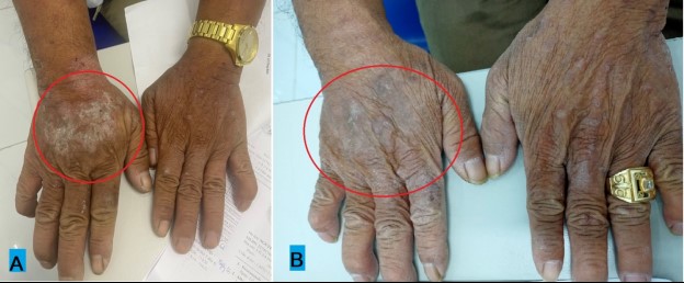 Hình 2. Hình ảnh lớp vảy trắng dày trên mu bàn tay phải bệnh nhân N.M.T trước vàsau 1 tháng điều trị (A: 12/09/2022, B:13/10/2022)