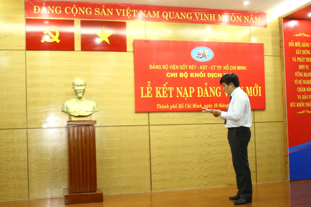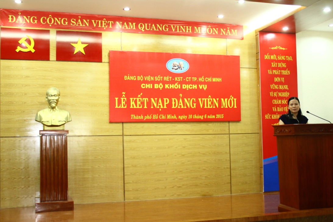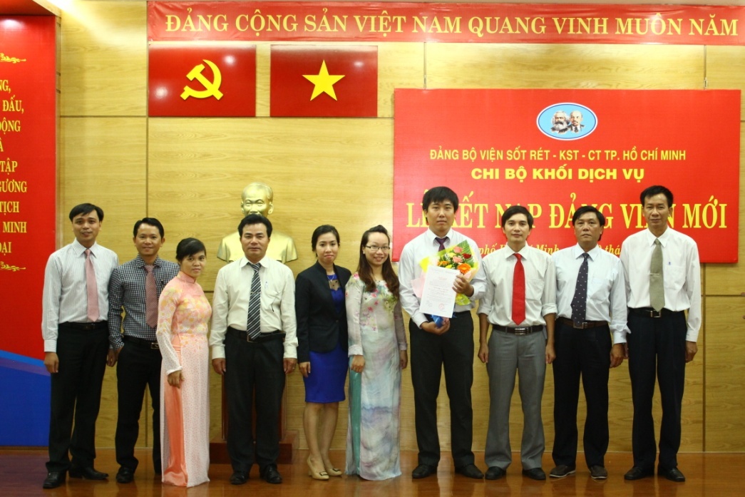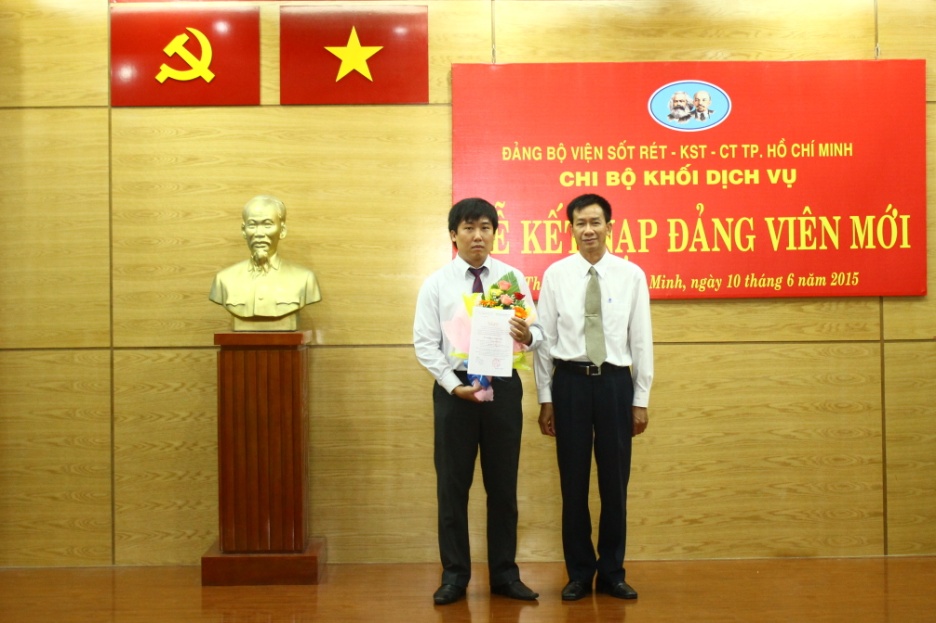 Sáng ngày 10/6/2015, Chi bộ khối Dịch vụ thuộc Đảng bộ Viện Sốt rét - Ký sinh trùng - Côn trùng Tp.HCM đã tiến hành tổ chức lễ kết nạp Đảng viên cho quần chúng ưu tú đang công tác tại Phòng Quản lý Khoa học và Đào tạo. Lễ kết nạp được tiến hành trong không khí trang nghiêm, theo đúng thủ tục được quy định.