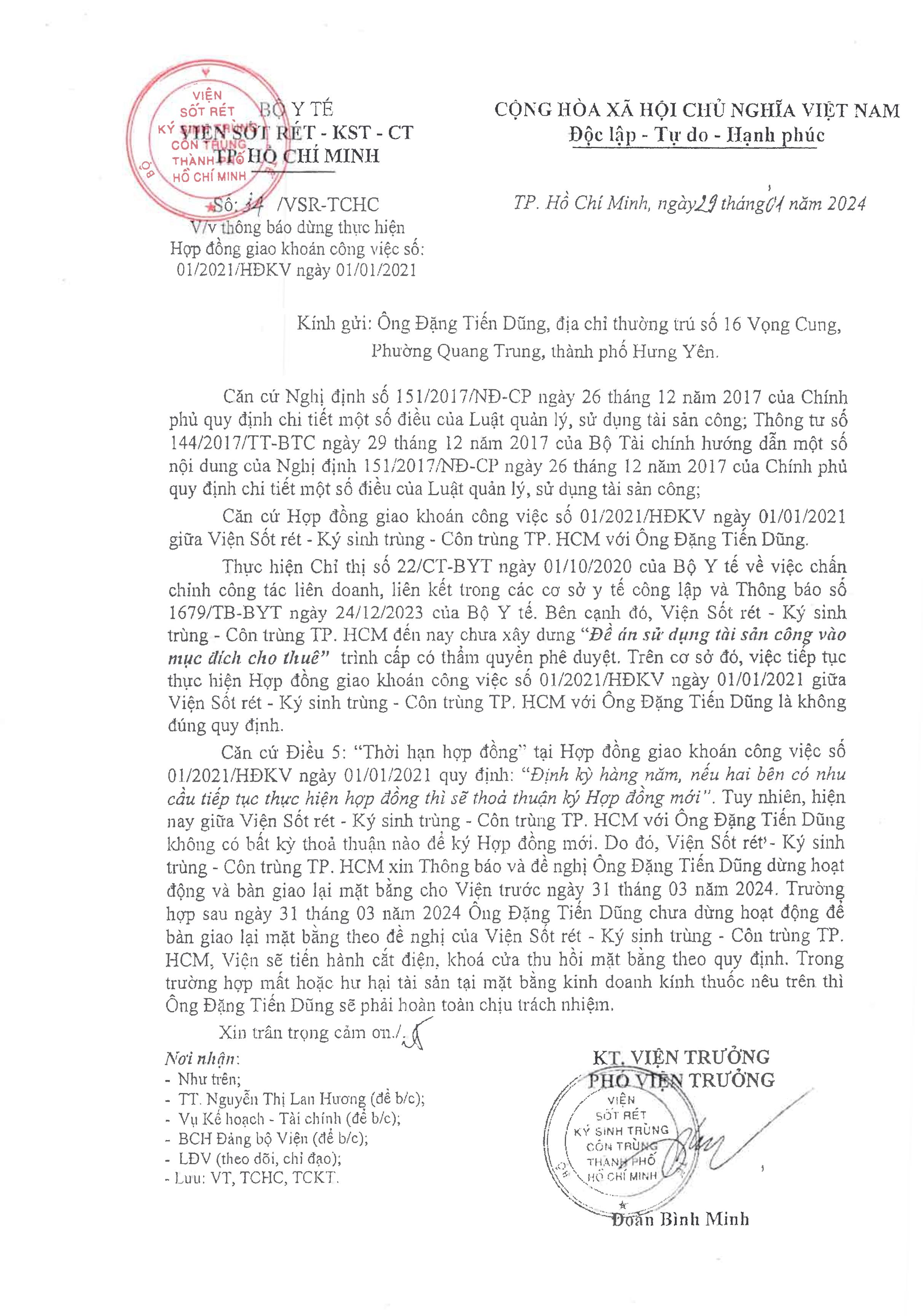 Thông báo về việc dừng thực hiện Hợp đồng giao khoán công việc số 01/2021/HĐKV ngày 01/01/2021