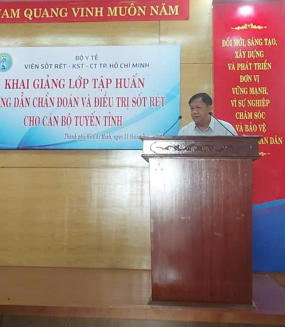Phát biểu, chỉ đạo lớp tập huấn, TS. Giang Hán Minh, Phó Viện trưởng, Phụ trách điều hành Viện Sốt rét - Ký sinh trùng - Côn trùng TP.HCM điểm qua về tình hình hoạt động phòng chống bệnh sốt rét, sốt xuất huyết và những khó khăn, thách thức về mục tiêu loại trừ bệnh sốt rét vào năm 2030, công tác phòng chống sốt xuất huyết. Phó Viện trưởng, nhấn mạnh trách nhiệm, vai trò đào tạo về chuyên môn, kỹ thuật về các bệnh truyền nhiễm một cách kịp thời cho cán bộ y tế của 20 tỉnh khu vực Nam Bộ - Lâm Đồng là nhiệm vụ cao cả mà Bộ Y tế giao. Phó Viện trưởng, chỉ đạo Ban tổ chức, giảng viên, báo cáo viên phụ trách hoàn thành nhiệm vụ được giao và đồng thời đề nghị cán bộ y tế tuyến tỉnh sau khi tiếp nhận kiến thức chuyên môn, kỹ thuật, về nơi công tác, địa phương của mình, chủ động triển khai hoạt động chuyên môn nơi mình đang công tác, tăng cường công tác thông tin, giáo dục, truyền thông một cách kịp thời cho người dân tại địa phương về việc phòng ngừa bệnh sốt rét, sốt xuất huyết an toàn và hiệu quả.
