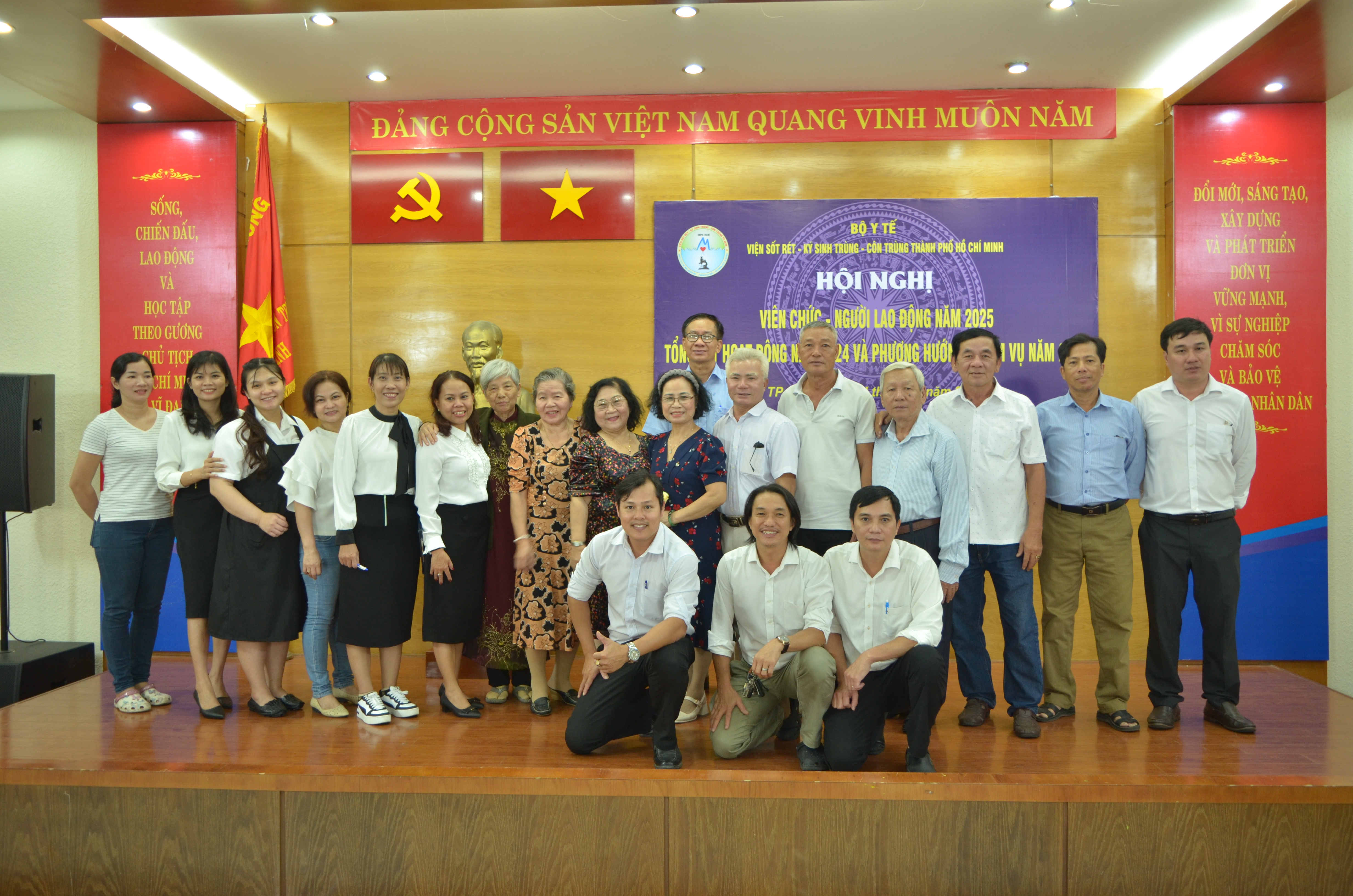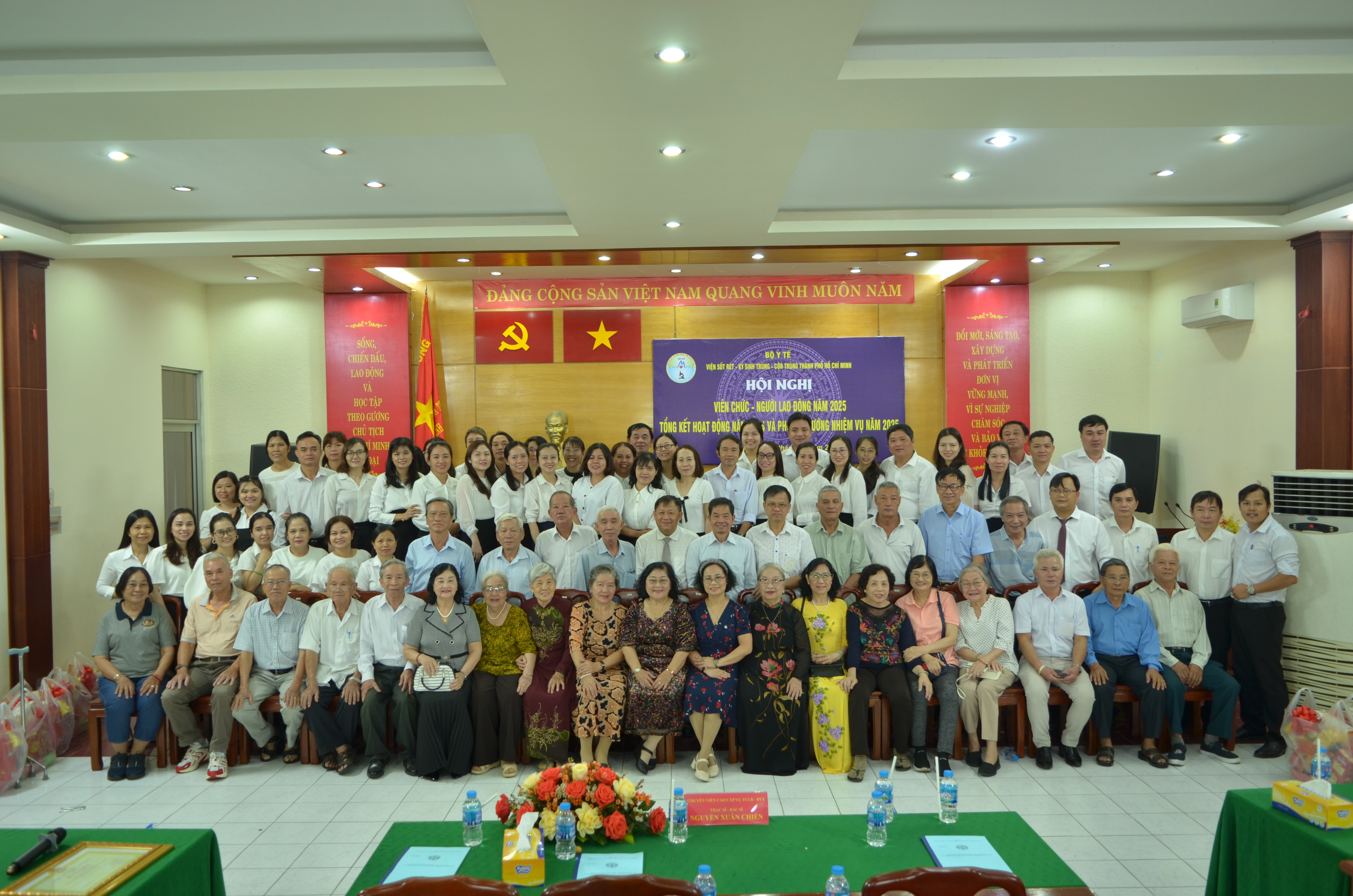 Lãnh đạo Viện và tập thể VC - NLĐ Viện Sốt rét - KST - CT TP.HCM chụp ảnh lưu niệm cùng cựu cán bộ, viên chức, người lao động của Viện qua các thời kỳ