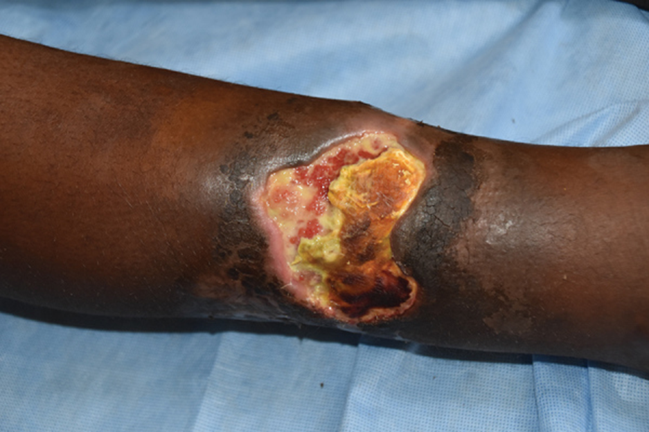 Hình 1.Tổn thương loét Buruli điển hình trên cánh tay của một bệnh nhân đến từ Ghana. Hoại tử trung tâm, có vảy màu trắng vàng, mép bị lõm bao quanh vết thương [4]