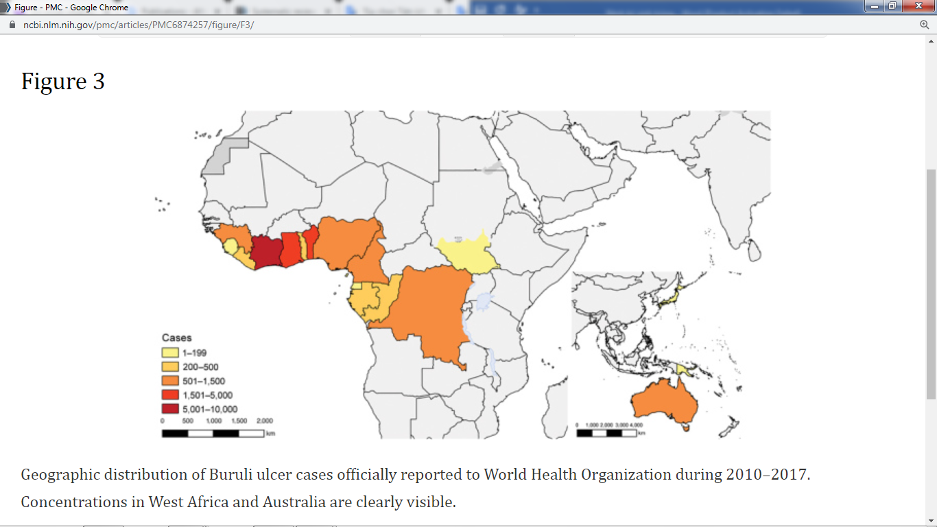 Hình 3.Phân bố địa lý của các trường hợp viêm da hoại tử Buruli [4]