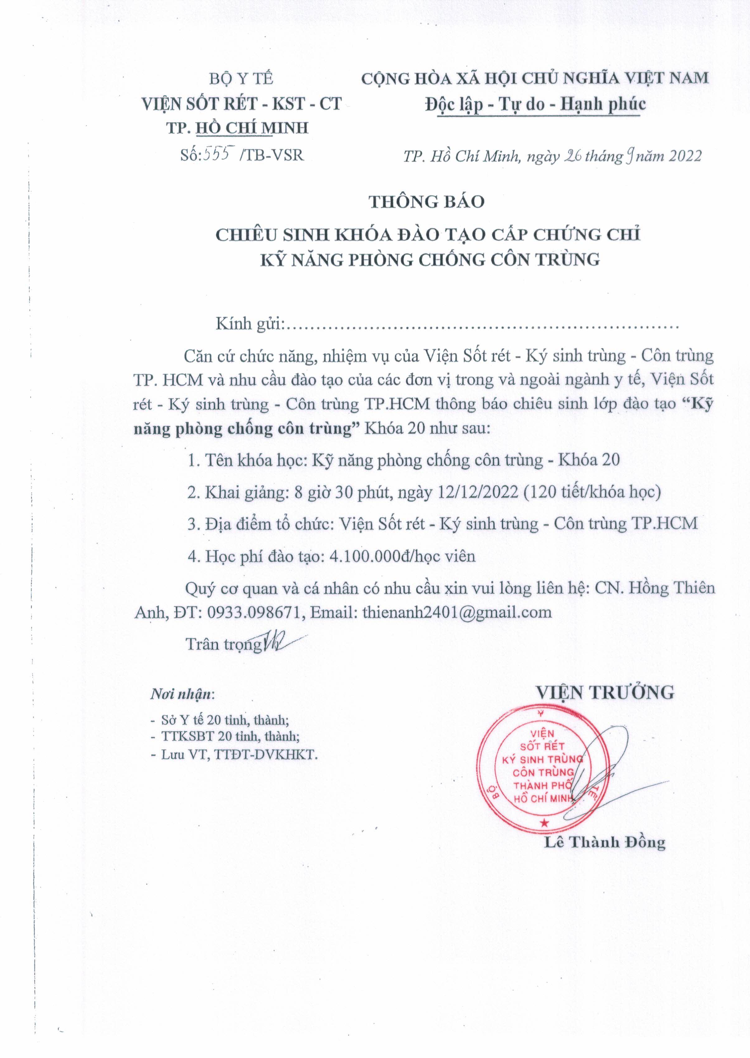 THÔNG BÁO CHIÊU SINH LỚP kỸ NĂNG PHÒNG CHỐNG CÔN TRÙNG - KHÓA 20